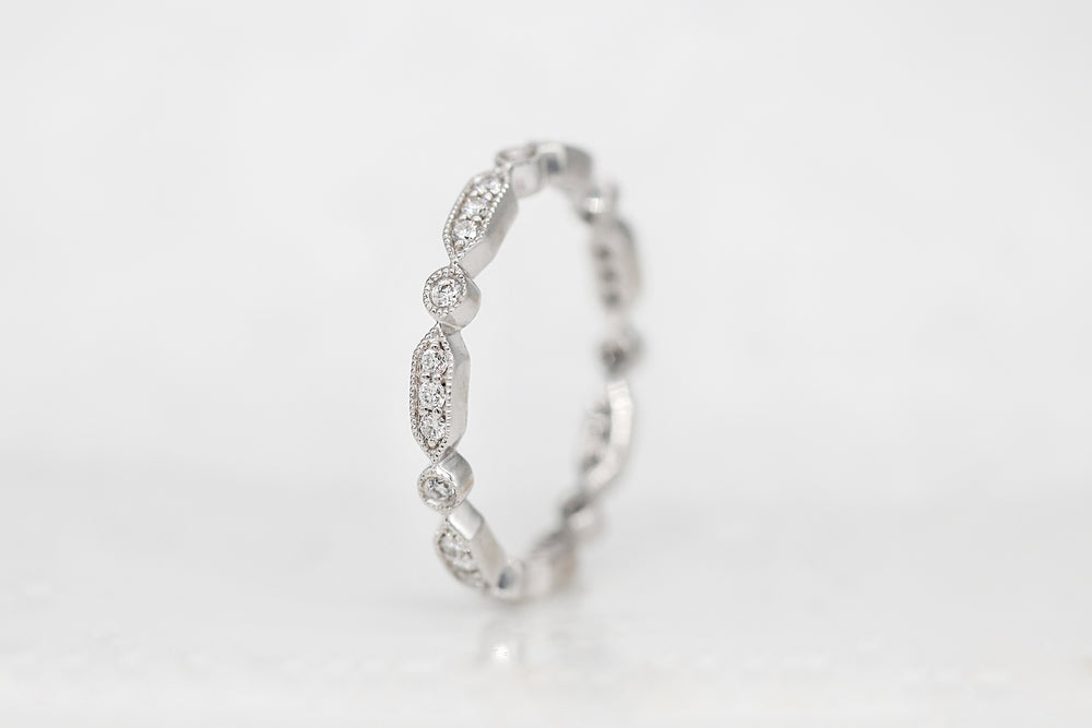 Our Deco Small Diamond Band is decadent dance of singles and trios of brilliant cut white diamonds. This eternity-style stacking ring is the perfect touch to finish your Sethi Stack.