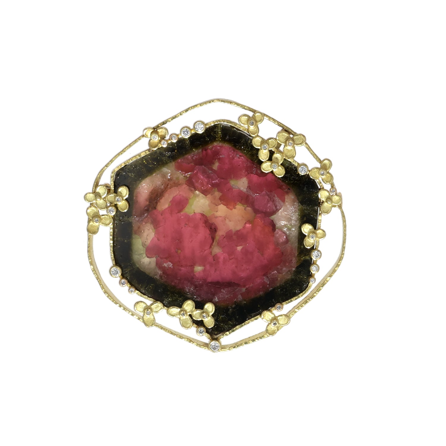 18K Yellow Gold Pendant or Brooch Featuring a Watermelon Tourmaline (67.75ctw) with a Double Textured Frame, Scattered Trillium, and Round Brilliant Cut Diamonds (0.32ctw).