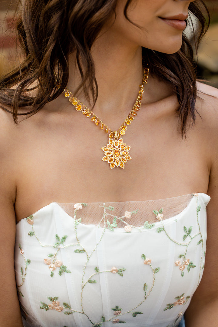 All the colors and the energy of the sun are captured in Erica Courtney’s 18K Yellow Gold Flower Pendant featuring a Mandarin Garnet Center (3.18 carat) with Mandarin Garnet Petals (9.67ctw) stylishly framed with the flourish of Diamond Pavé Outlines (2.10ctw). Orange Sapphire Necklace Chain Sold Separately. Reference: 03-00039