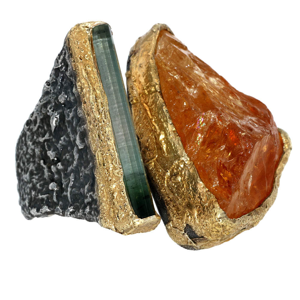 24K Yellow Gold and Sterling Silver Ring with Raw Citrine and Tourmaline.