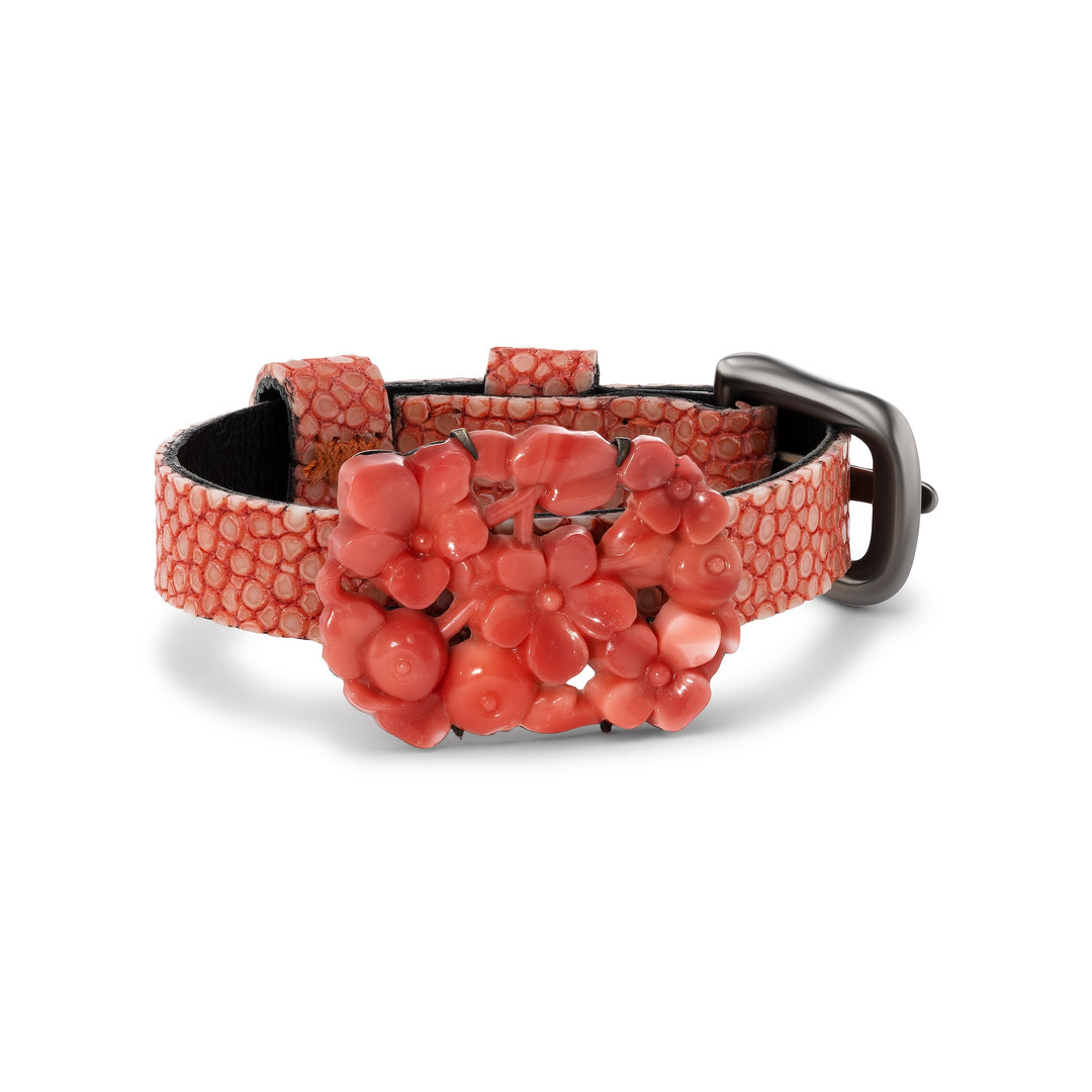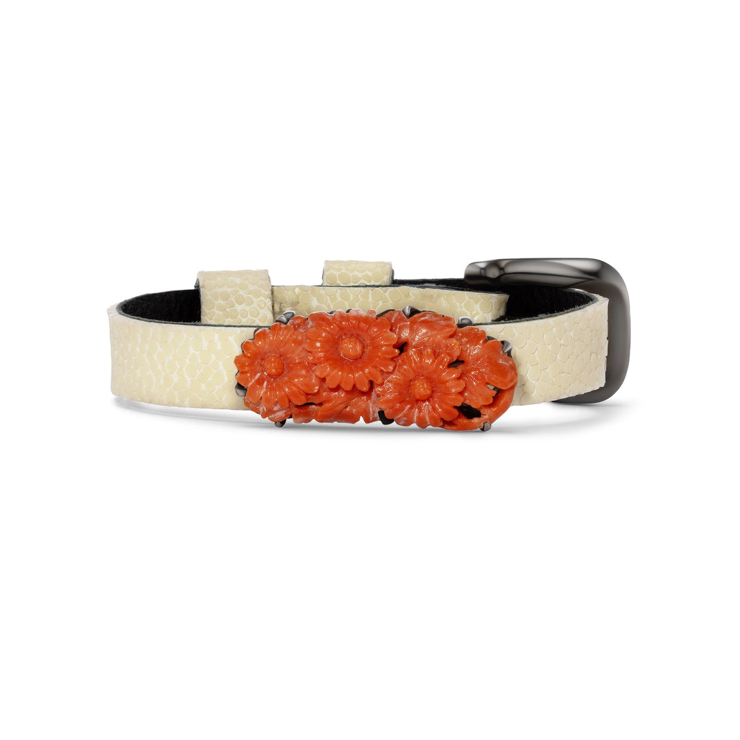 Carved Flower Red Stone Bracelet with Galuchat Leather Strap