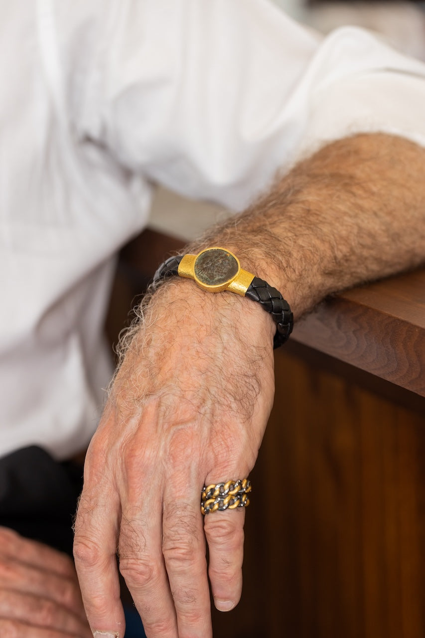 18K Yellow Gold Black Leather Bracelet with Alexander the Great Coin.