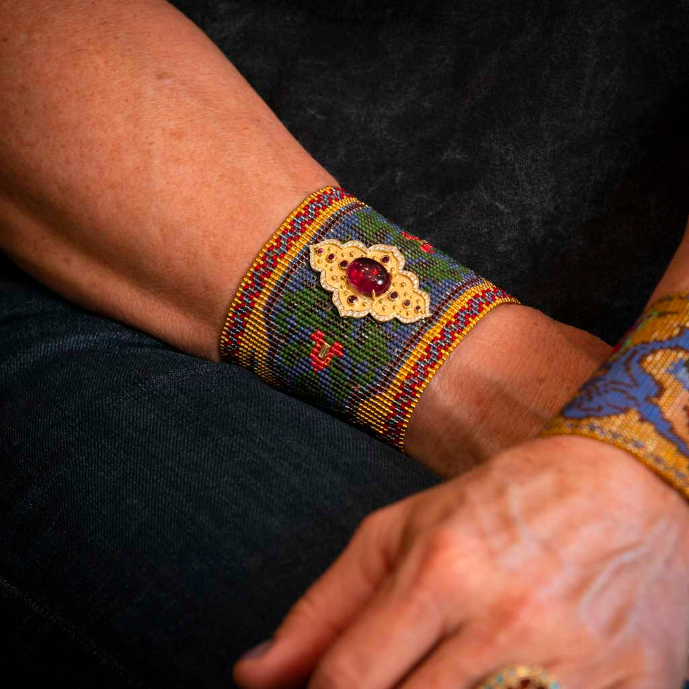 Like wearing a beautiful jewel encrusted rug on your wrist, designer Silvia Furmonovitch calls this fantastical cuff “Silk Road Bracelet”. She has woven porcelain beads in 18K yellow gold, placed a Pink Tourmaline (9.01 carat) Rubies (0.89ctw) and Two Baguette Diamonds (0.06ctw) in the center and made sure this beauty will stay on with a secure magnetic clasp. This is truly a wearable work of art. Come try it on today. Reference: 08-00027