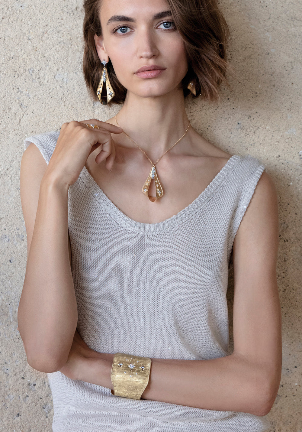 Show the world your Wonder Woman status by wearing Bizzotto Gioielli’s powerful Gold Wide Cuff Bracelet with Diamond Stars(0.33ctw). The brushed satin finish catches the light in a lovely way plus there is a small gold safety chain in the back to insure it stays put. Comfort and looks don’t often go together, but here…they do.
