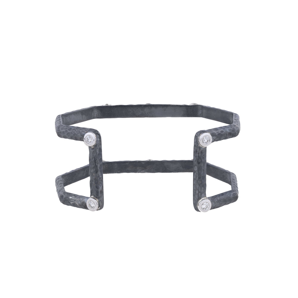 Oxidized Silver Hammered "Octagon" Open Cuff Bracelet with Diamonds set in 18K White Gold Bezels (0.95ctw). Reference: 09-00027