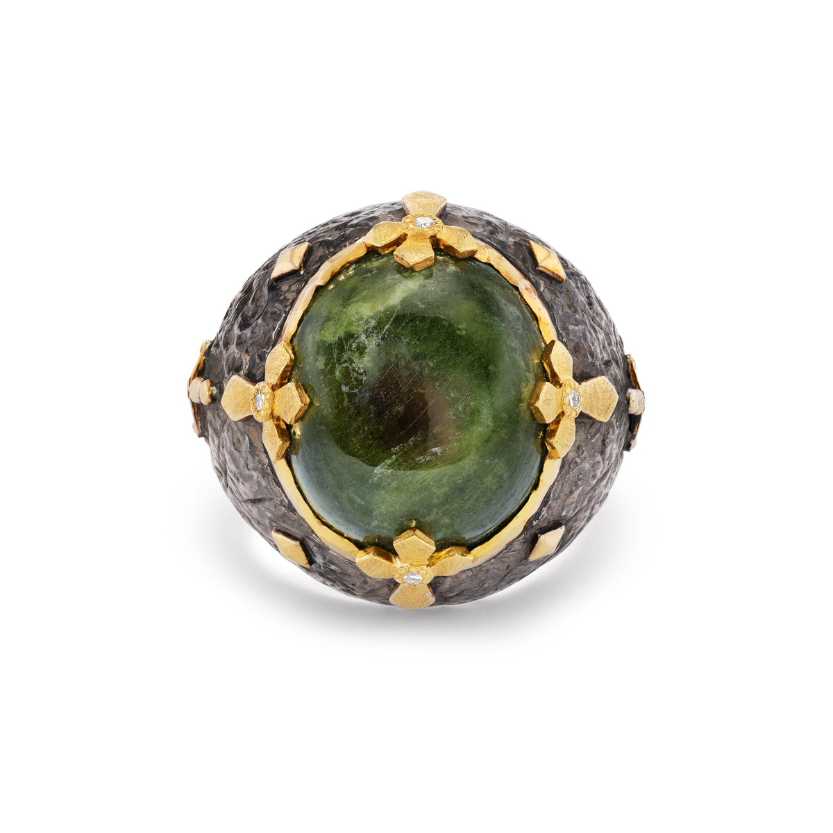 24K Yellow Gold and Silver Ring with Green Sapphire (47.51 carat) and Diamonds (0.06ctw). Reference:05-00035
