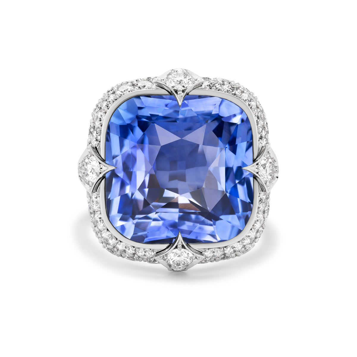 This remarkable platinum ring features a 17.26 carat cushion-cut sapphire in a pastel shade of blue that feels both unexpected and enchanting. The hue is soft yet vibrant, carrying a feminine radiance rarely seen in sapphires. Its luminous color draws the eye with a mesmerizing charm that feels light, fresh, and utterly distinctive. 78 pavĂ©-set colorless diamonds weighing a total of 3.20 carats frame the sapphire. Their brilliance creates a delicate halo of light, enhancing the gem’s airy vibrancy while lending the design an added layer of sophistication. Bayco has transformed this rare, colored sapphire into a jewel that celebrates individuality and beauty in its purest form. Elegant and radiant, it is a ring that captivates with grace rather than grandeur, offering a treasure as wearable as it is collectible. Platinum, Cushion Cut Sapphire Ring 17.26 cts with colorless pavĂ© diamonds, 78=3.20 cttw by Bayco. Certificate of Authenticity No: 1800841 Reference No: 05-01194