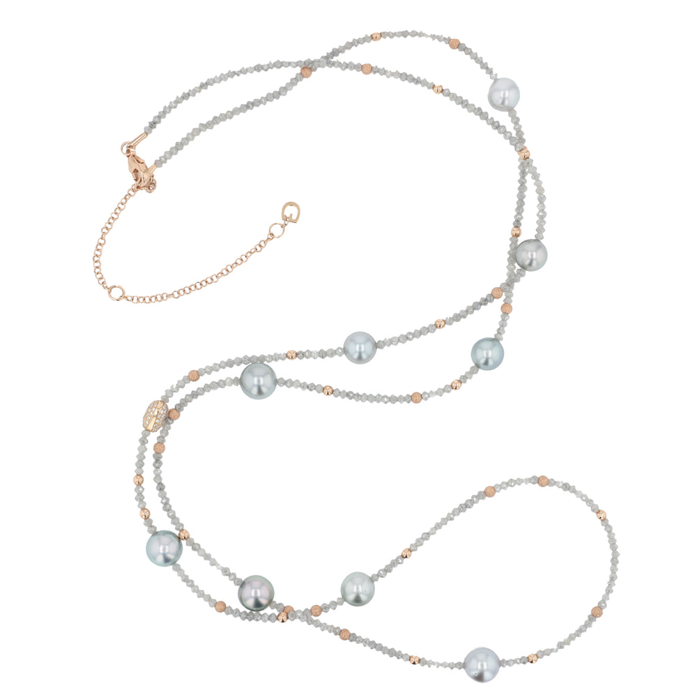 18K Intense Rose Gold Diamond Bead Necklace with 9 Tahitian-cultured pearls 8-10mm. 39" in length. Reference No: 01-01206