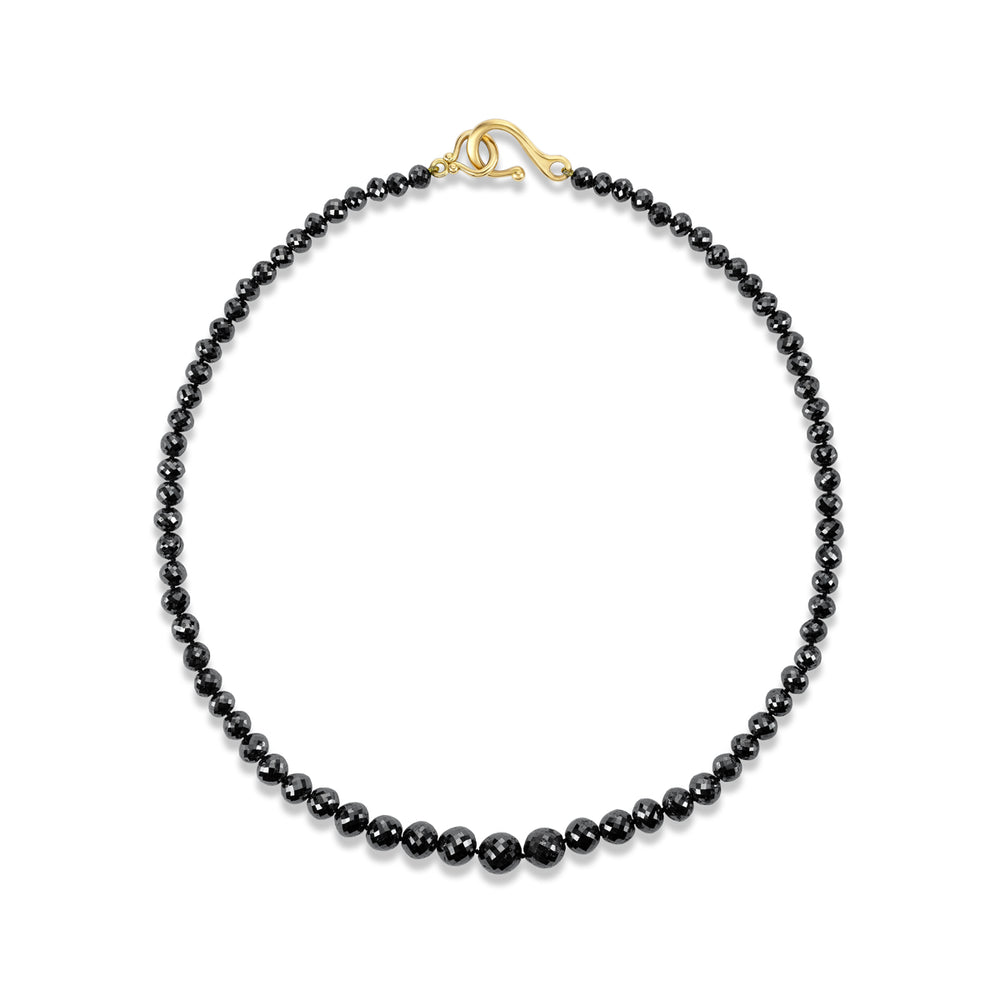 Drape your Diva-self in the drama of faceted Black Diamonds. Paula Crevoshay’s has chosen a 16” length of graduated Black Diamonds (120.03ctw) and fashioned them together with a lovely 18K Yellow Gold hook and eye clasp. Reference: 01-00033