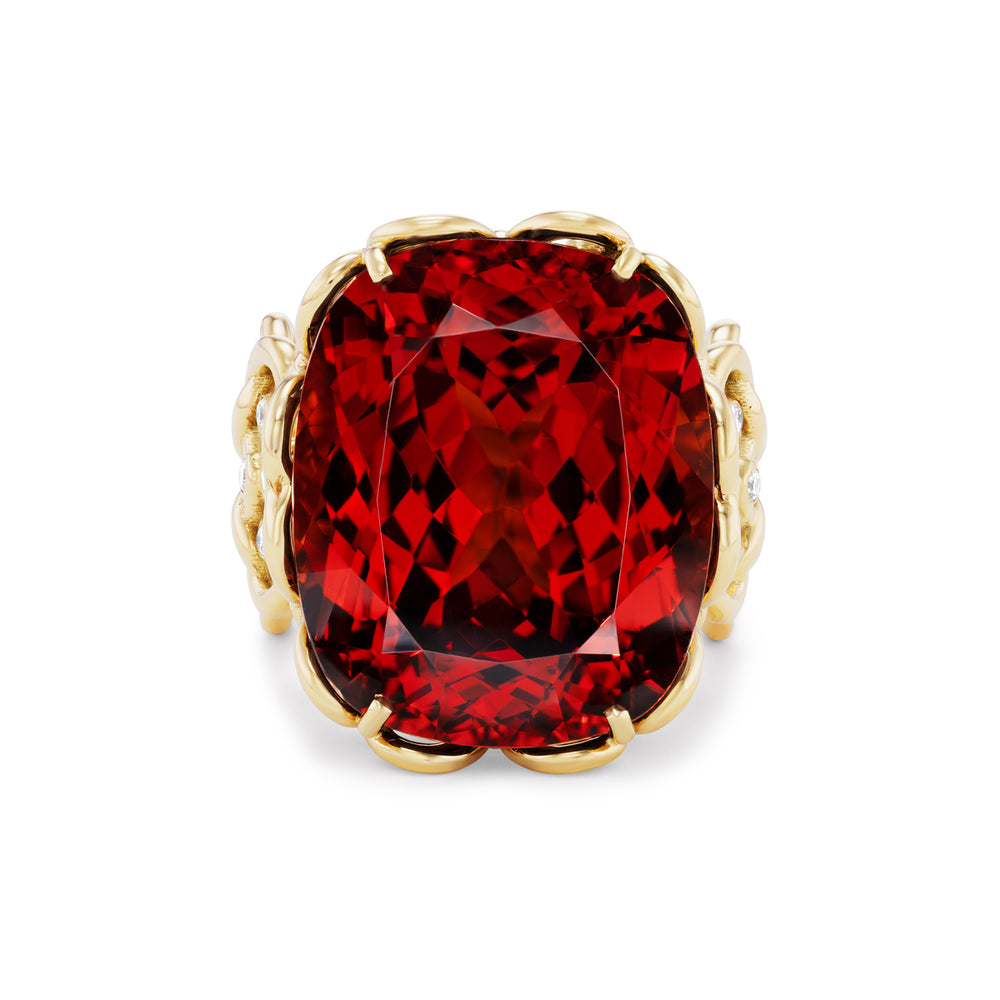 Erica specializes in One-Of-A Kind gemstones featured in her show-stopping designs. This Incredibly Rare 45.47-carat Spessartite Garnet fires off deep red, orange and magenta hues in contrast to the glowing swirls and flourishes of 18K Yellow Gold and the flicker of Diamond Accents (0.76ctw). Reference No: 05-00182