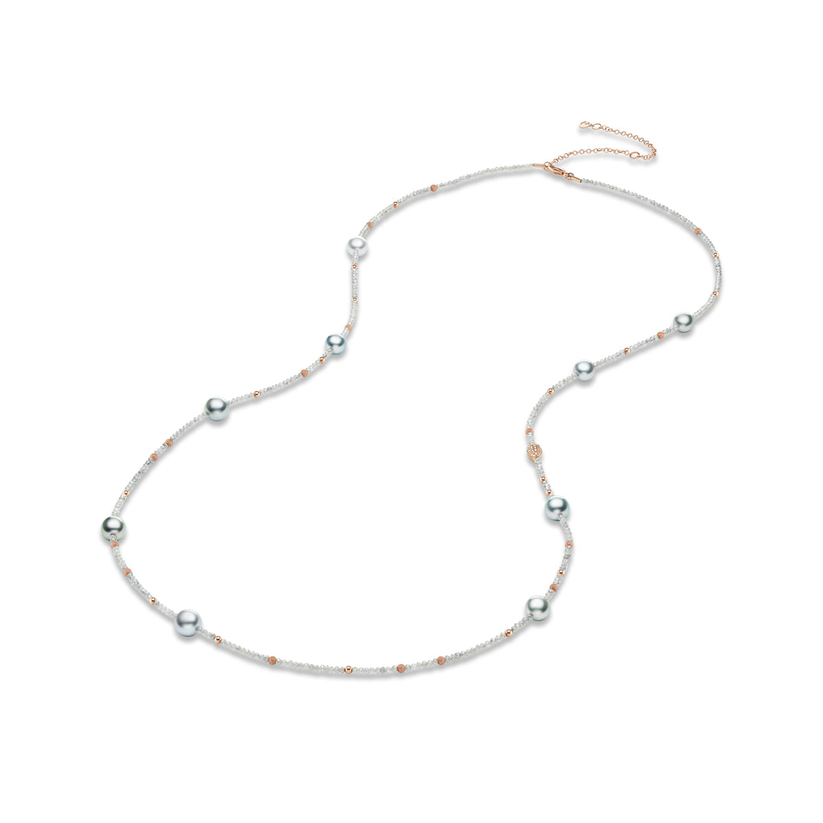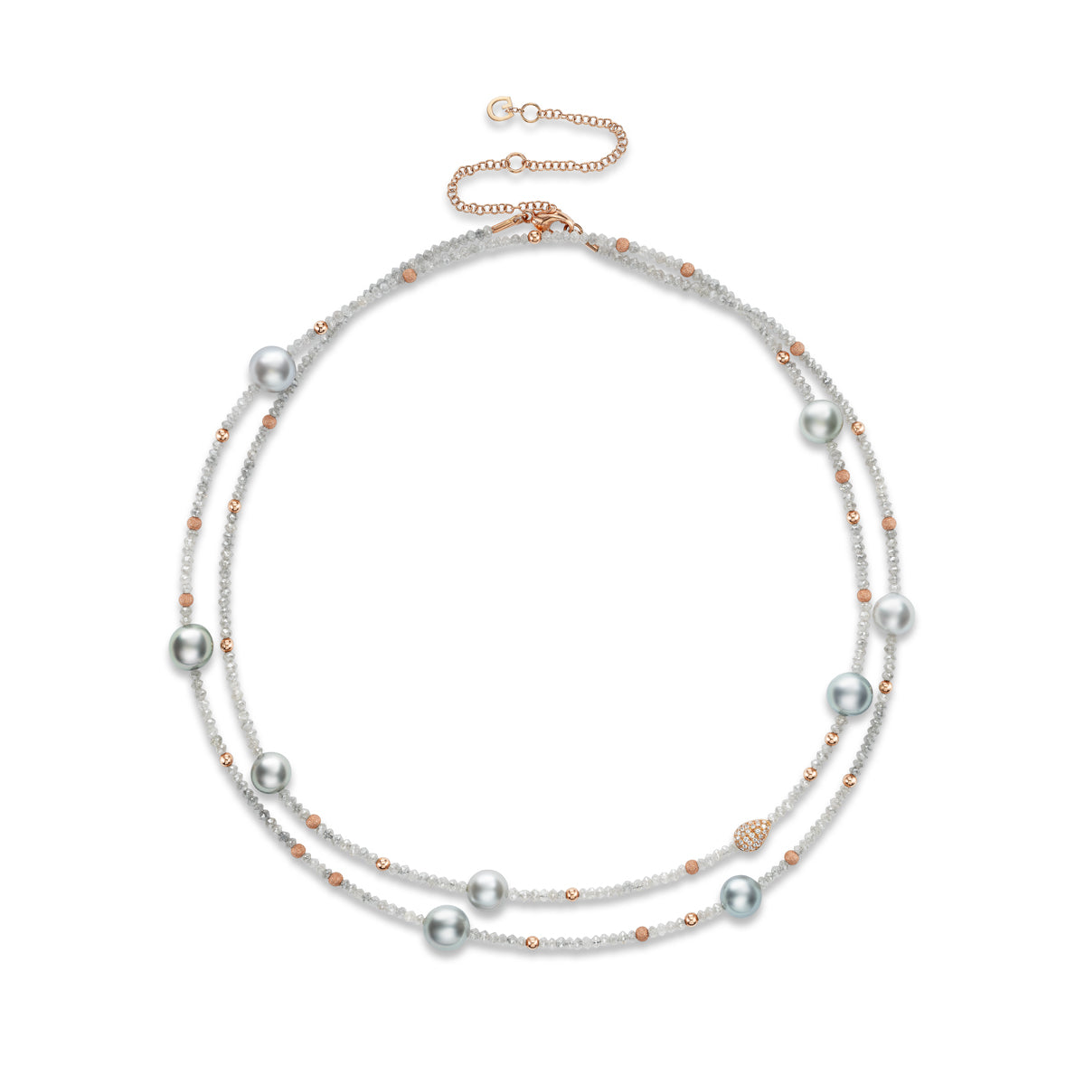 18K Intense Rose Gold & Diamond Bead Necklace from the Gellner Castaway line, featuring Tahitian-cultured Pearls Diamond beads, approx 42 - 51 cttw, anthracite; 9 Tahitian-cultured pearls, silver /light, semi round 8-10 mm; 72 round brilliant cut diamonds (0.36 cttw) on 18K Rose Gold station. 39" in total length with adjustable settings also at 35" and 37", lobster clasp. Reference No: 01-01206