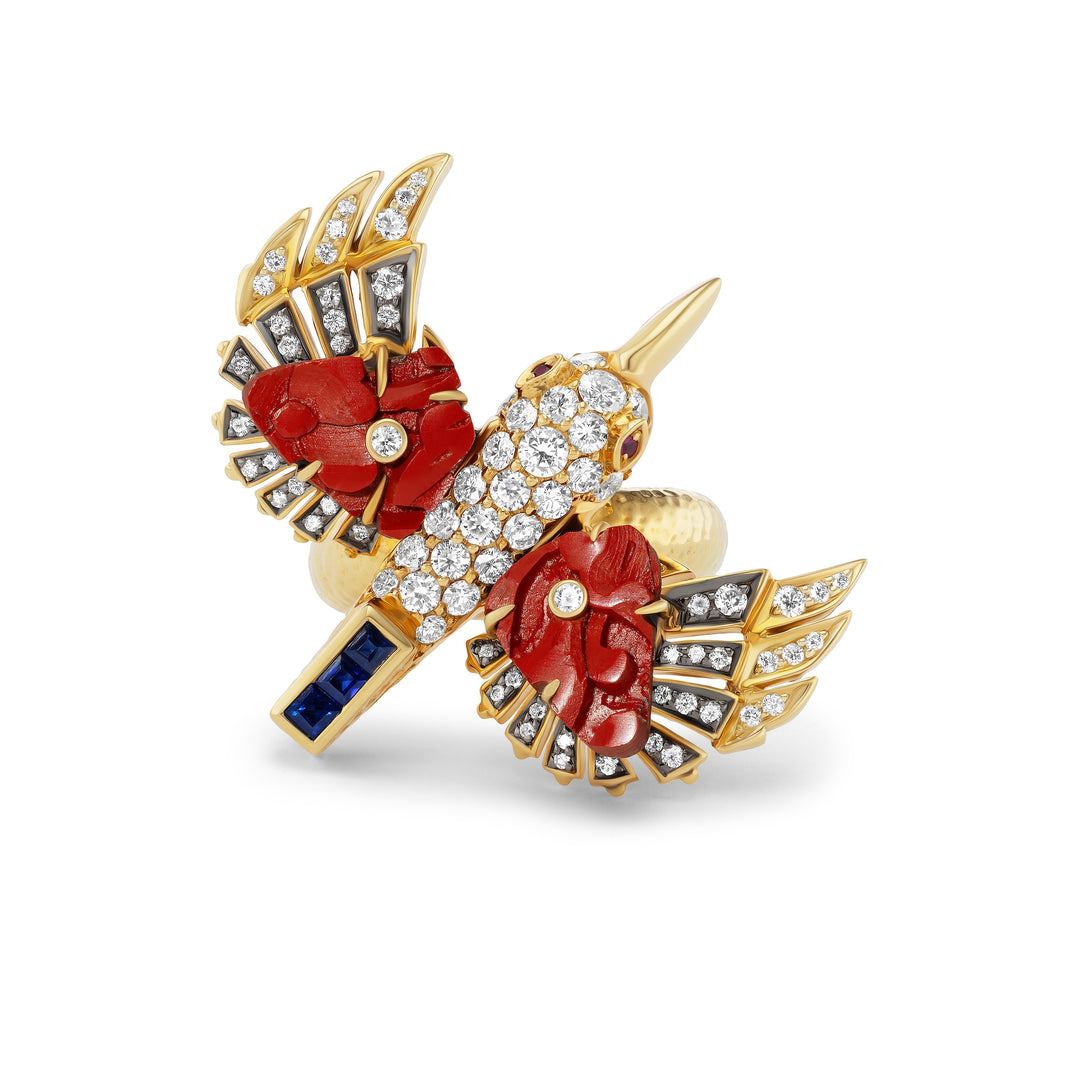 18K Yellow Gold Bird in Flight Ring with Cinnabar Lacquer