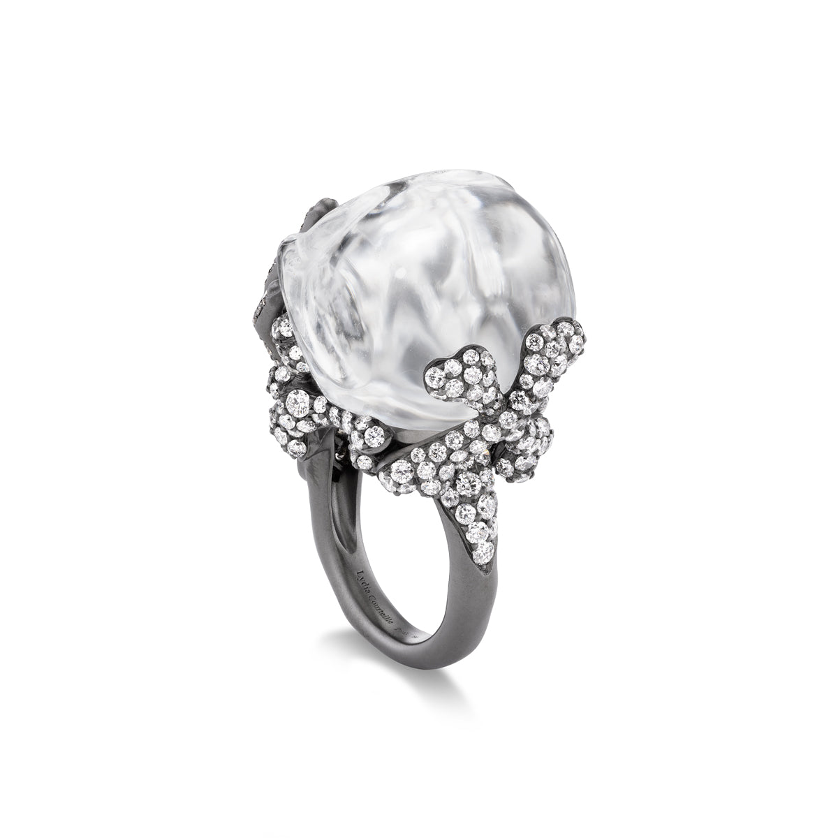 Edgy, enigmatic, and exquisitely crafted, this Lydia Courteille skull ring captures the designer’s signature blend of artistry and rebellion. Sculpted in luminous 18K gold, a carved white crystal skull becomes the centerpiece—its haunting beauty illuminated by 2.79 carats of white diamonds and 1.56 carats of rich brown diamonds. Both macabre and magnificent, this piece is a collector’s dream, balancing dark romanticism with impeccable craftsmanship. It is a true conversation piece from one of Paris’s most daring jewelry visionaries. 18K Black Gold Ring with White Crystal Skull with White (2.798ctw) and Brown (1.559ctw) Diamonds. Reference: 05-00072