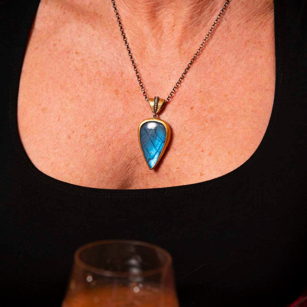 24K Yellow Gold and Sterling Silver Necklace with Labradorite and Diamonds.