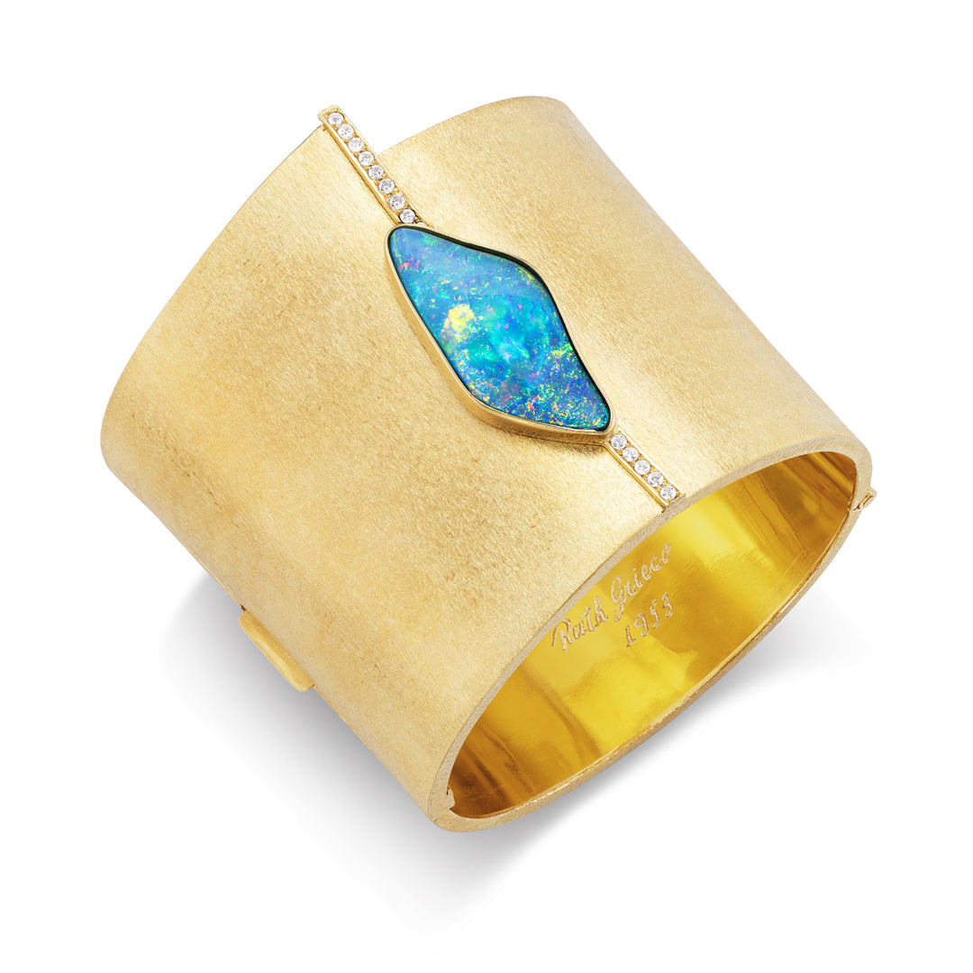 18K Yellow Gold, Boulder Opal, Sapphire and Diamond Hinged Bracelet