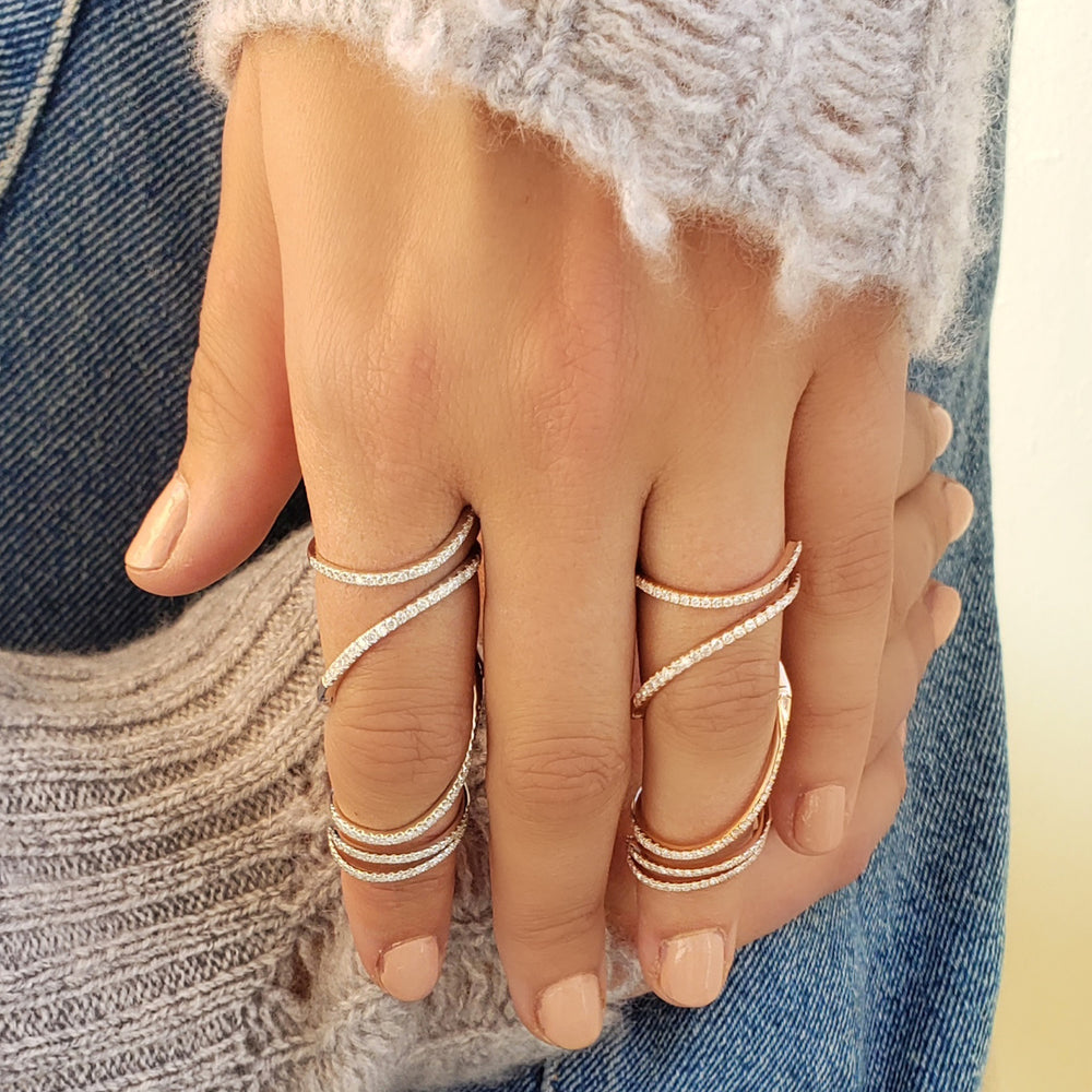 We call this ring by Brazilian designer Graziela Kaufman “The Conversation Starter” because, well, it does. Slide the ravishing 14K White Gold Mega Swirl on your finger, and you will notice it starts on one side of your knuckle and ends on the other. Wait…what? How will you be able to move your finger? As graceful as you please, an almost hidden hinge moves right along with your fingers and easily bends to your every gesture punctuated with 0.92ctw of sparkling Diamonds. Size 7 Reference No: 05-00277