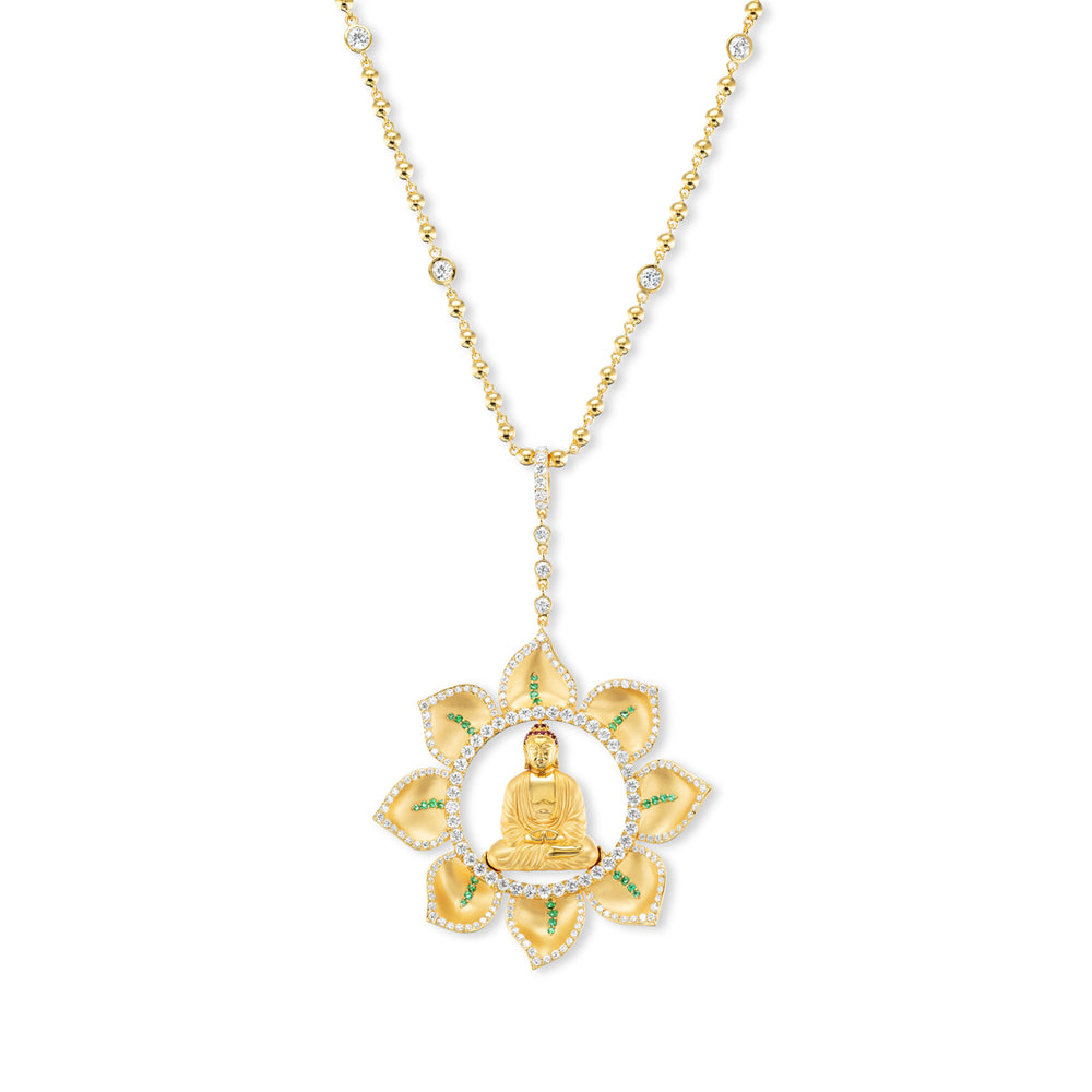 20K Yellow Gold Large Buddha in Lotus Pendant with Diamonds (6.38 cttw) Pink Sapphires (0.49 cttw) and Emeralds (0.60 cttw). Chain Sold Separately. Reference: 03-00014