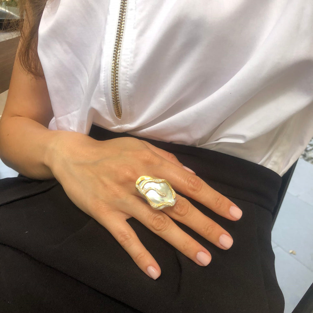 22K Yellow Gold "Lydia" Baroque Pearl and Diamond Ring