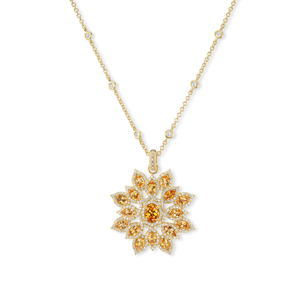 All the colors and the energy of the sun are captured in Erica Courtney’s 18K Yellow Gold Flower Pendant featuring a Mandarin Garnet Center (3.18 carat) with Mandarin Garnet Petals (9.67ctw) stylishly framed with the flourish of Diamond Pavé Outlines (2.10ctw). Orange Sapphire Necklace Chain Sold Separately. Reference: 03-00039