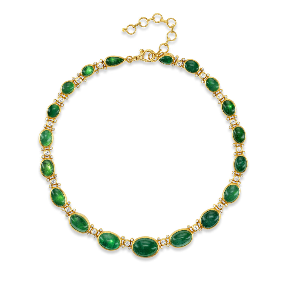 This One of a Kind 24K/22K Yellow Gold, Emerald and Diamond Necklace features bezel set, mixed sized oval and drop cabochon emeralds (98.93 cttw) with butterfly connection with 5 brilliant cut diamonds (3.09 cttw) between each emerald. 22K YG handmade lobster clasp with 14.5"-16.75" extension chain. Reference No.: 01-02592