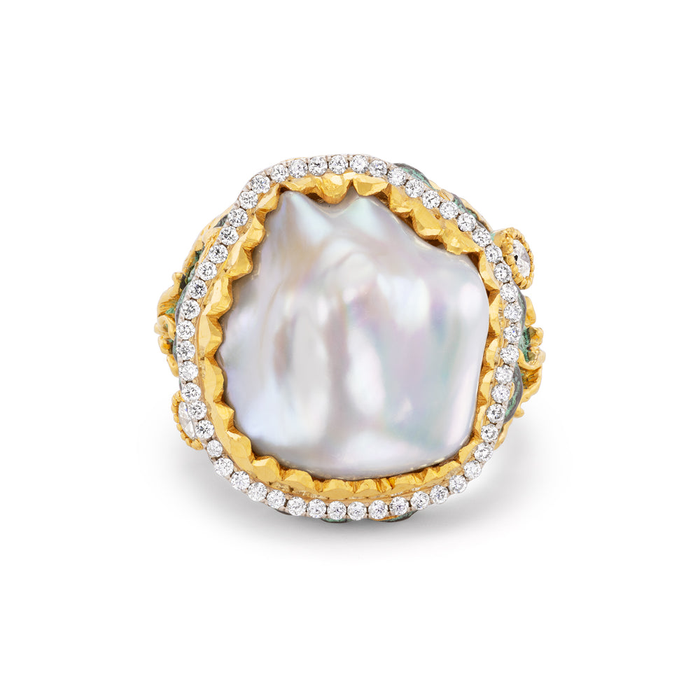 24K &18K Yellow Gold, Silver, Pearl & Diamond Ring