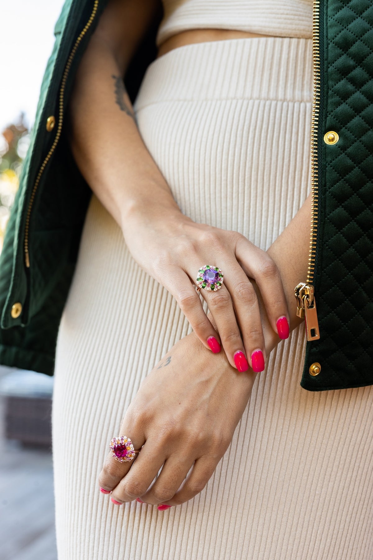 18K Rose Gold Ring by Sofragem with Deep Pink Rubellite (4.59 ct) center stone surrounded by Pink Sapphires (1.72 cttw); Orange Sapphires (0.76 cttw) and Diamonds (0.58 cttw). 7.30 gram gold weight. Ring Size 6.5 Reference No: 05-01359