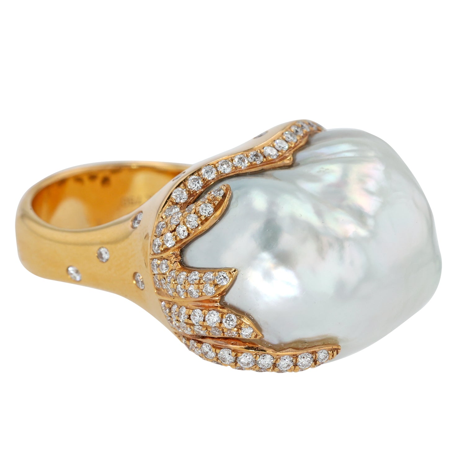 18K Rose Gold Ring by Tara & Sons features this magnificent White South Sea Pearl which measures 18mm-19mm with diamonds (0.98 cttw). Size 7. Reference: 05-00055