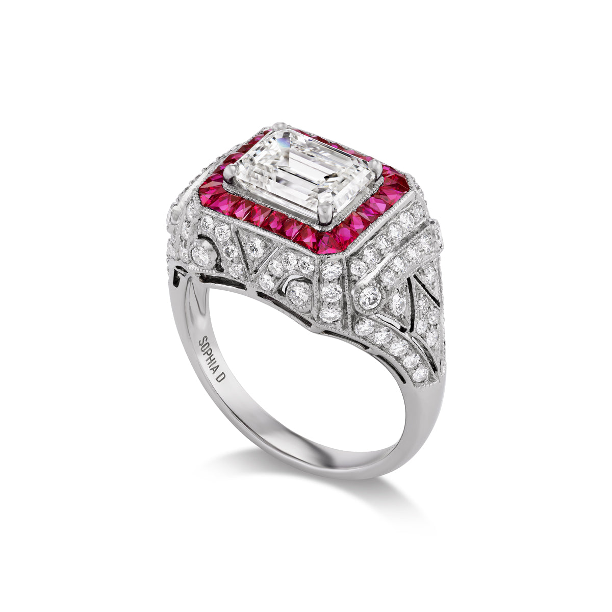 A study in vintage elegance, this platinum ring features an emerald-cut diamond set east to west, framed by a square halo of vibrant rubies. The deep red stones create a striking contrast against the cool brilliance of platinum and the soft shimmer of diamond accents. Every angle reveals thoughtful detail, from the symmetry of the setting to the delicate craftsmanship that defines its character. Refined yet full of emotion, this ring evokes the romance of another era while remaining effortlessly at home in the present. Platinum Ring featuring Emerald Cut Diamond Center with Ruby and Diamond Accents. Reference No: 05-03834