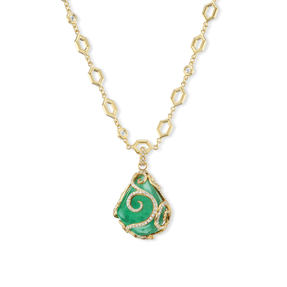 Designed to dazzle and inspire the envy of others, Erica Courtney’s Emerald City Pendant features a whopping 105.99 carat Emerald Drop organically encased in sexy swirls of brilliant diamonds (2.78ctw) She reminds me of Cinderella's fairy godmother whose Bibbitty-Bobbitty-Boo turned a pumpkin into a carriage, Erica turned this stone into a guaranteed showstopper that will make everyone see green! Chain Sold Separately. Reference: 03-00037