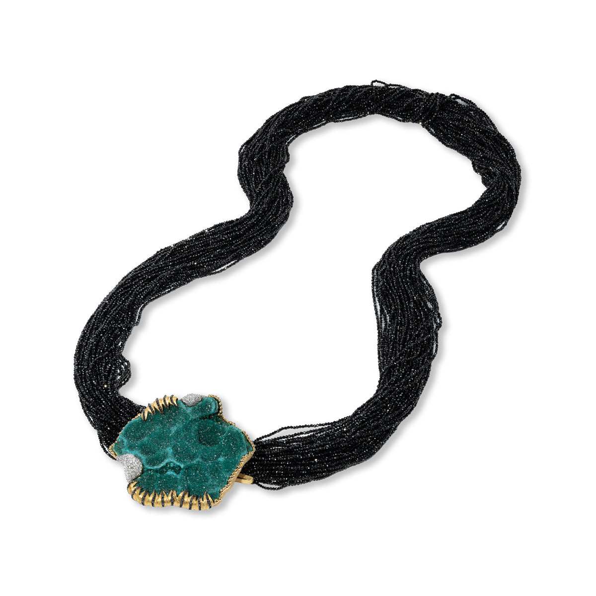 A one-of-a-kind creation of commanding presence, this Victor Velyan necklace fuses elemental strength with sculptural grace. Over a thousand carats of faceted black spinel—arranged in dramatic multi-strand form—flow toward a breathtaking centerpiece: a 425.12-carat dioptase from the Republic of Congo, encased in luminous 18K yellow gold.