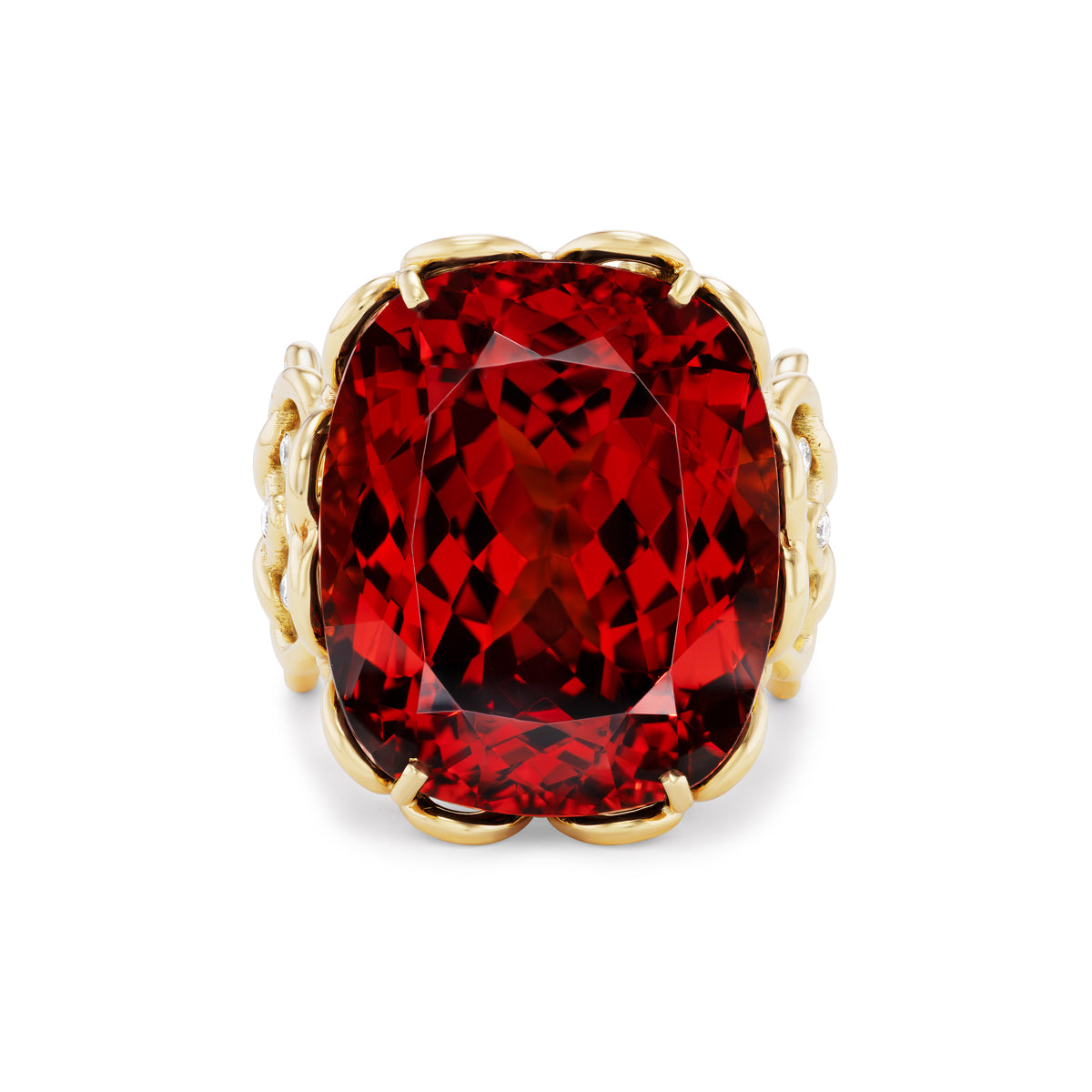 Erica specializes in One-Of-A Kind gemstones featured in her show-stopping designs. This Incredibly Rare 45.47-carat Spessartite Garnet fires off deep red, orange and magenta hues in contrast to the glowing swirls and flourishes of 18K Yellow Gold and the flicker of Diamond Accents (0.76ctw). Reference No: 05-00182