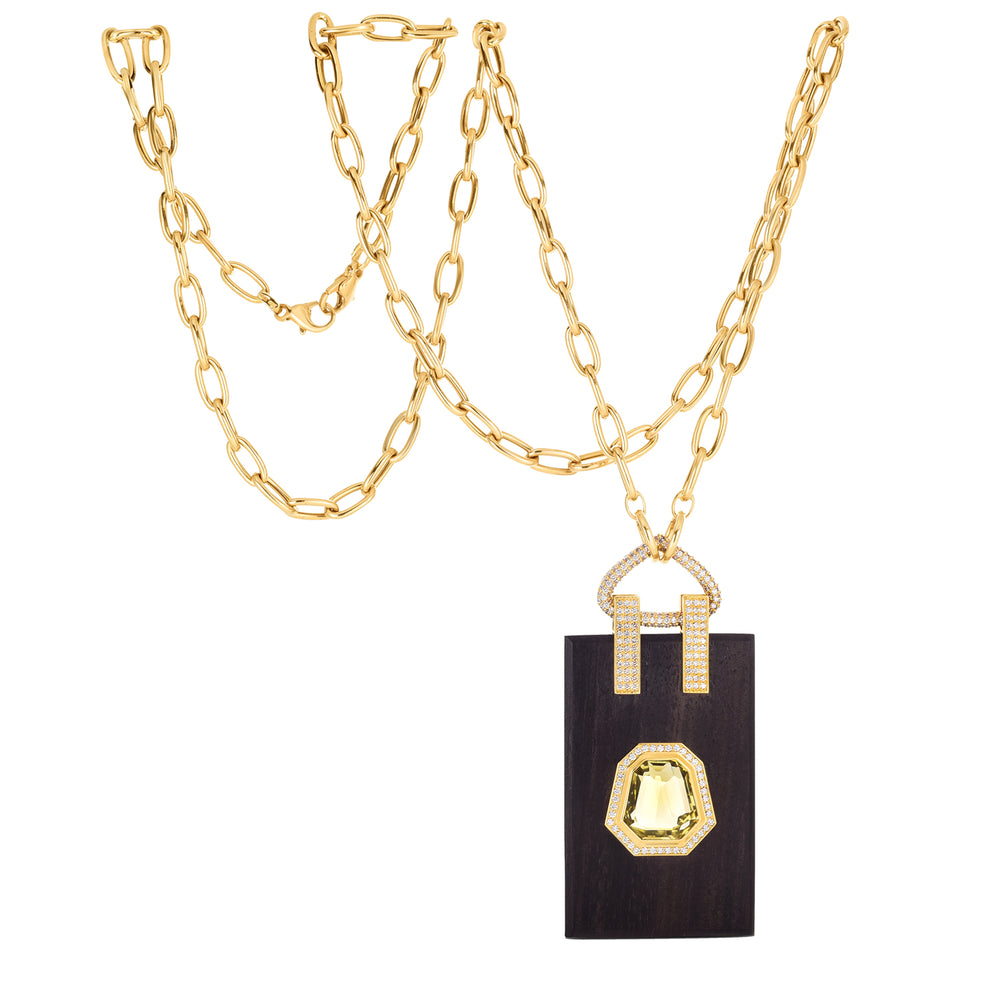 18K Yellow Gold Carved Ebony, Yellow Citrine and Diamond Pendant